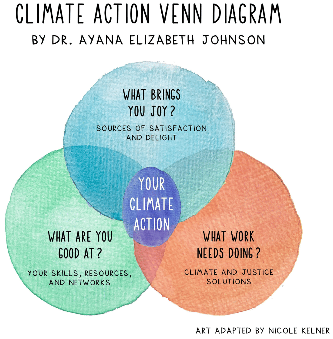 In climate work, I return to Dr. Ayana Elizabeth Johnson’s climate action Venn diagram: What brings you joy? What are you good at? What work needs doing?